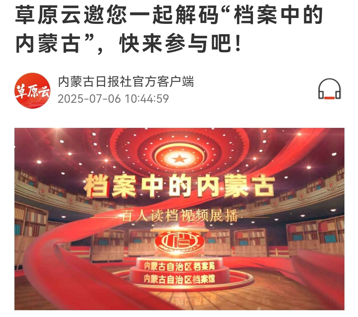 “檔案中的內(nèi)蒙古”百人讀檔視頻展播節(jié)目在草原云客戶端展播。