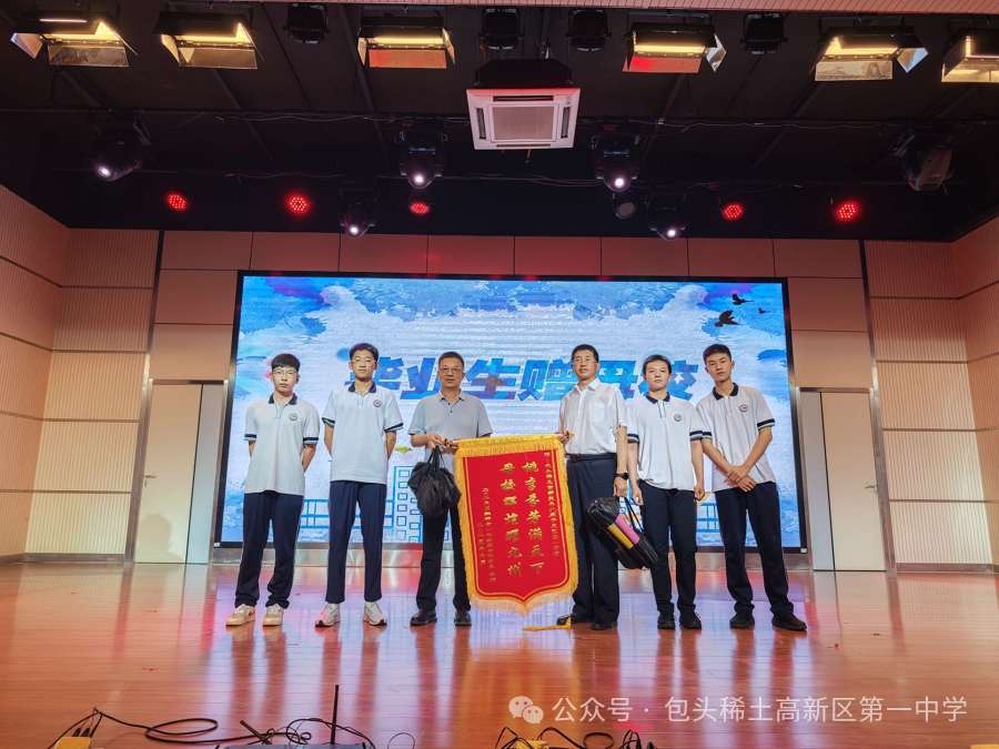 學生代表向母校獻禮,表達對母校的祝愿:桃李芬芳滿天下,母校輝煌耀九州!